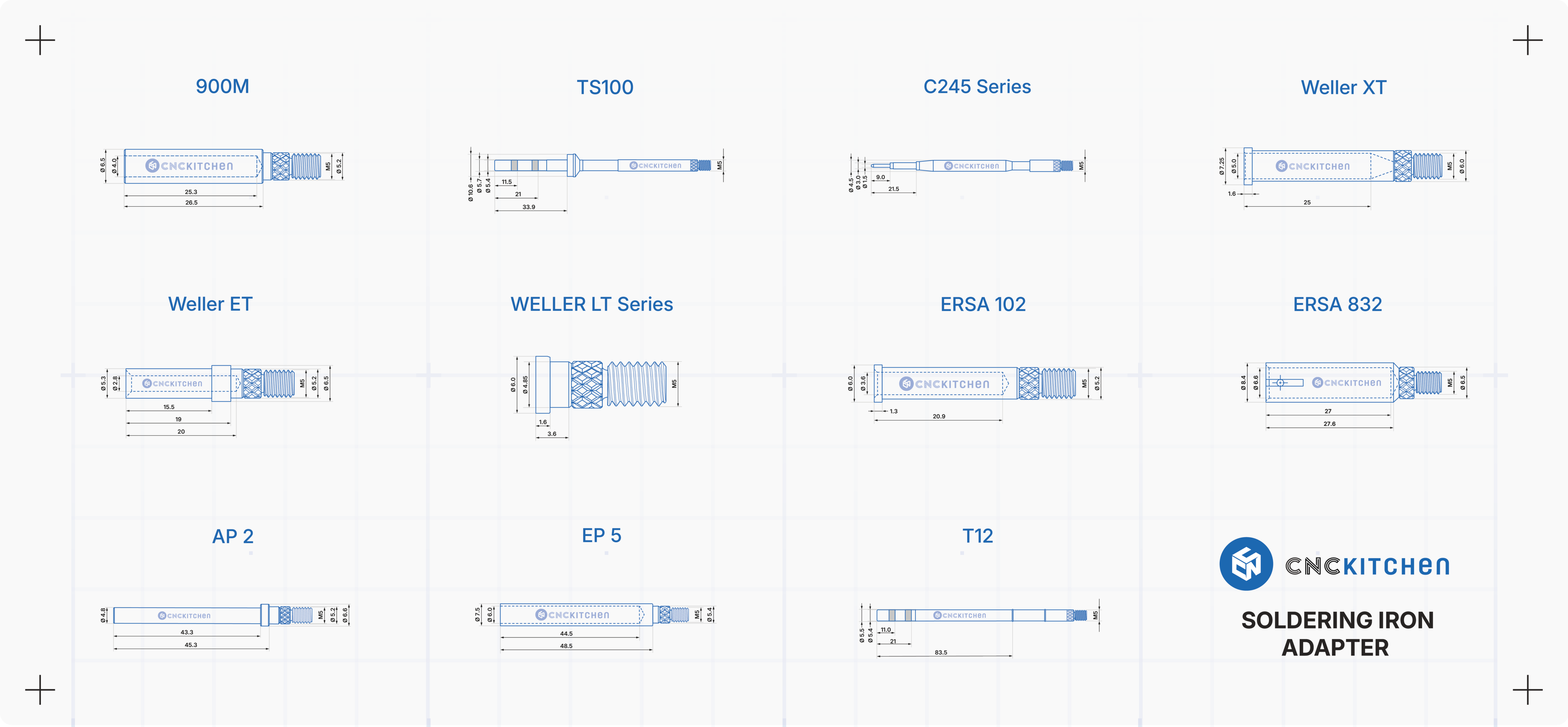 A forrasztóhegyek kompatibilisek a T12-es standard forrasztópákákkal, és tökéletesen illeszkednek a CNC Kitchen menetes betétekhez. Lézeres jelölésekkel és hornyokkal rendelkeznek az egyszerű méretazonosítás érdekében.