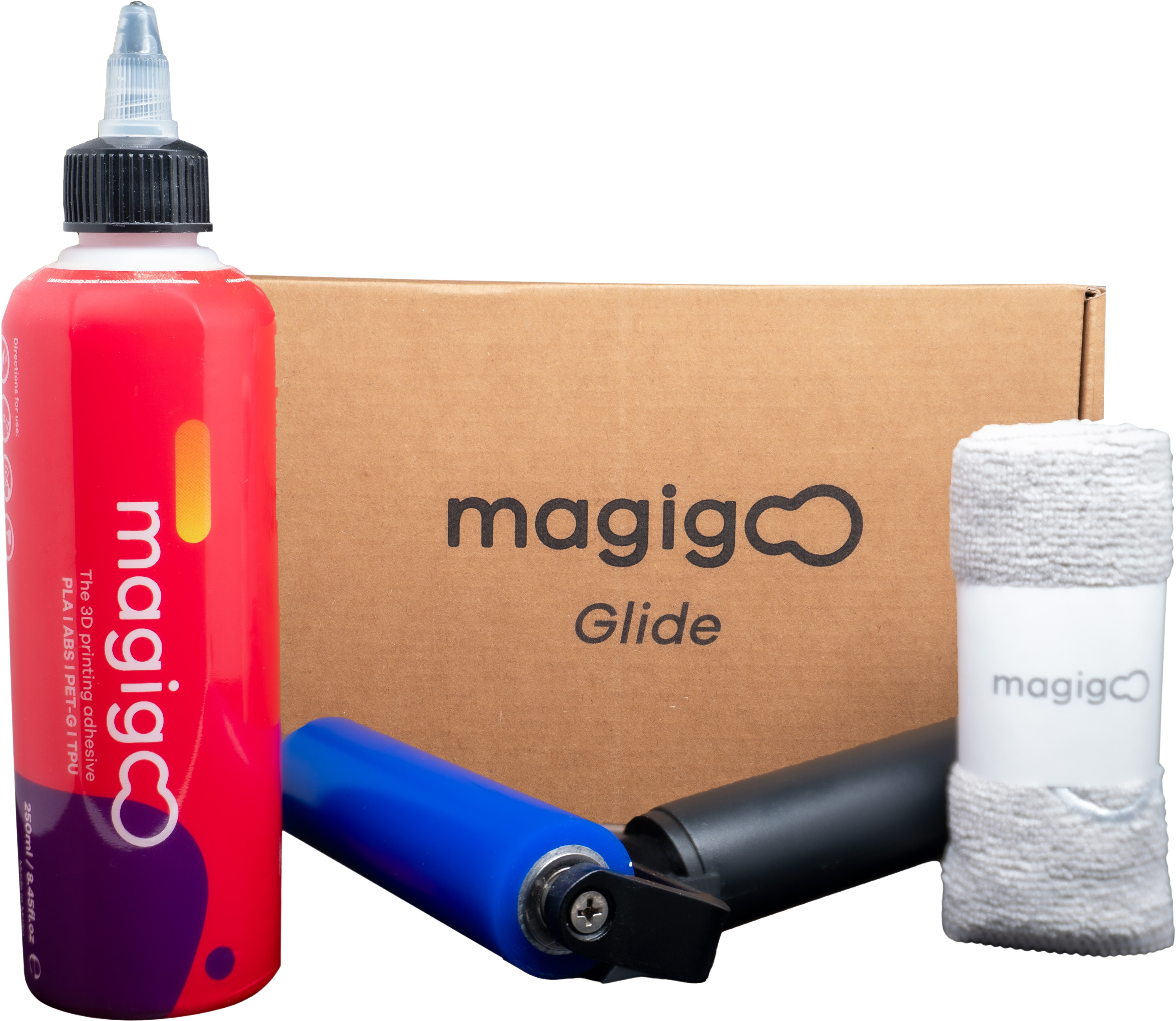 A készlet lelke a Magigoo Glide Roller, amely gyorsan és egyenletesen eloszlatja a ragasztót – függetlenül attól, hogy a tárgyasztal kicsi vagy nagy. A mellékelt Roller Stand biztosítja, hogy a Roller tiszta maradjon a használatok között, és a ragasztós felülettel felfelé tárolható - így megakadályozva a por vagy szennyeződés felhalmozódását. A szettet egy 250 ml-es Magigoo Original flakon egészít ki, amelyet a PLA, ABS, PET-G és számos más elterjedt és műszaki, hőre lágyuló műanyag megbízható tapadására terveztek, valamint egy tisztítókendő a nyomtatási felület egyszerű, vízbázisú tisztításához.