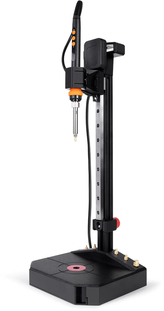 A robusztus, 210 mm-es úthosszal rendelkező lineáris csúszka nyugodt, függőleges vezetést biztosít a forrasztópákának. Ennek köszönhetően a menetbetétek pontos szögben és kontrollált módon helyezhetők be – még nagyobb vagy összetettebb alkatrészek esetén is.