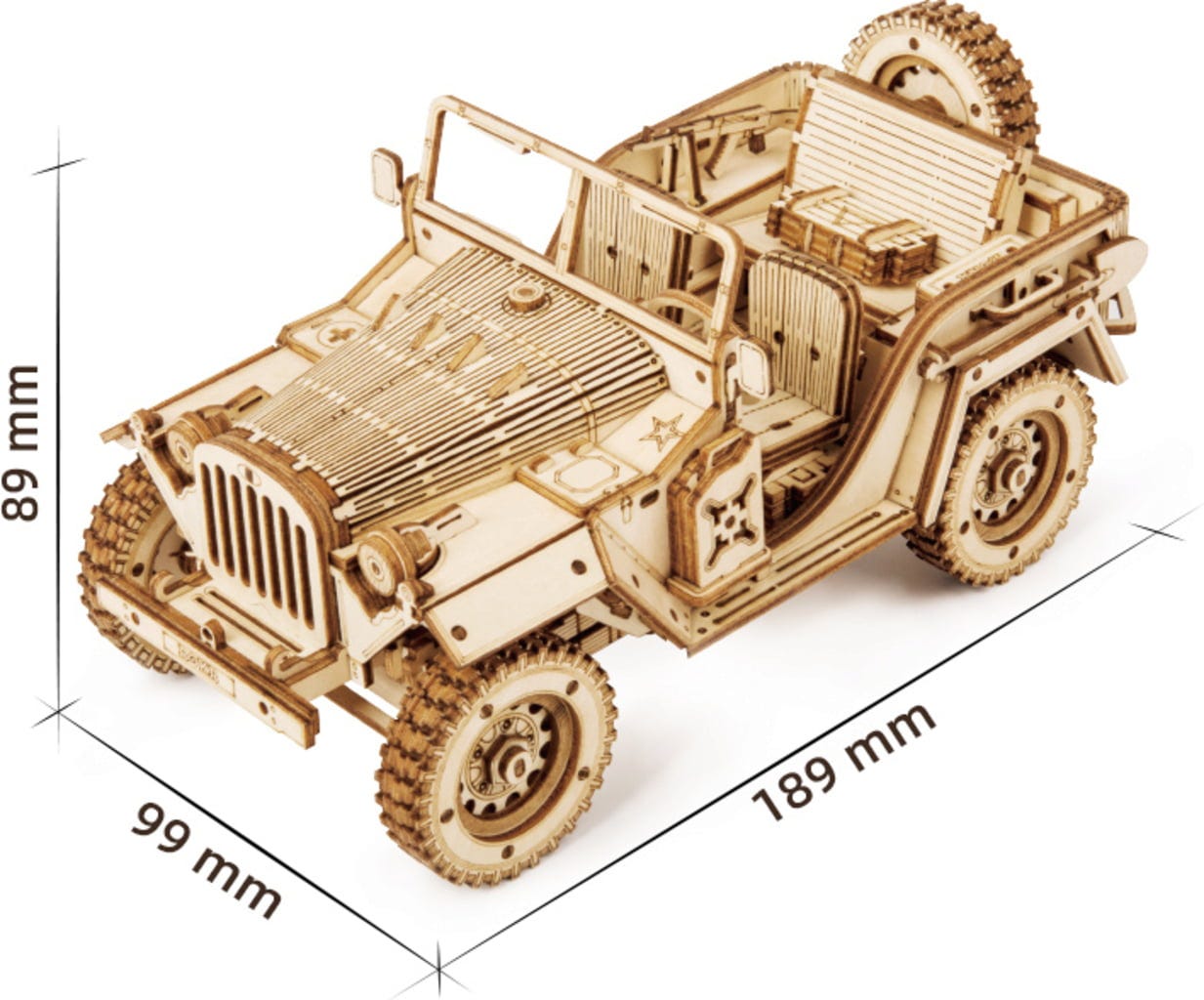 Okosan összerakva, ragasztó nélkül: Az Army Field Car lézervágott rétegelt lemezből készült, amely szépen kidolgozott, sima és kényelmes a kézben tartani. Minden alkatrész előre elkészített, és egyáltalán nem igényel ragasztót. Ehelyett okos csatlakozások és egymásba illeszkedő mechanizmusok biztosítják a stabilitást és a meglepően okos felépítést.