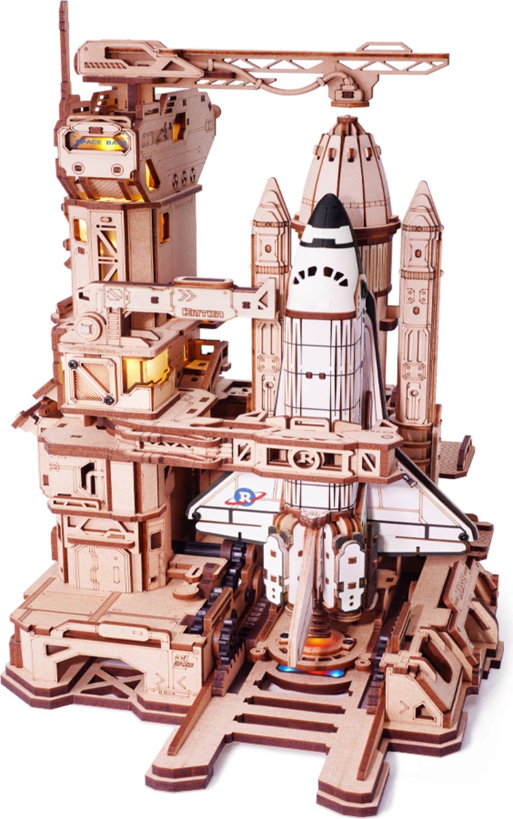 Egy ikon fából: Maga az űrsikló a klasszikus orbiter-profilon alapul: két gyorsítórakéta, fehér panelek, delta-szárnyak, farokuszony-stabilizátor és a jellegzetes lekerekített orr. Minden részlet a valódi küldetéseket, a valódi indításokat és a valódi űrutazás történetét idézi.