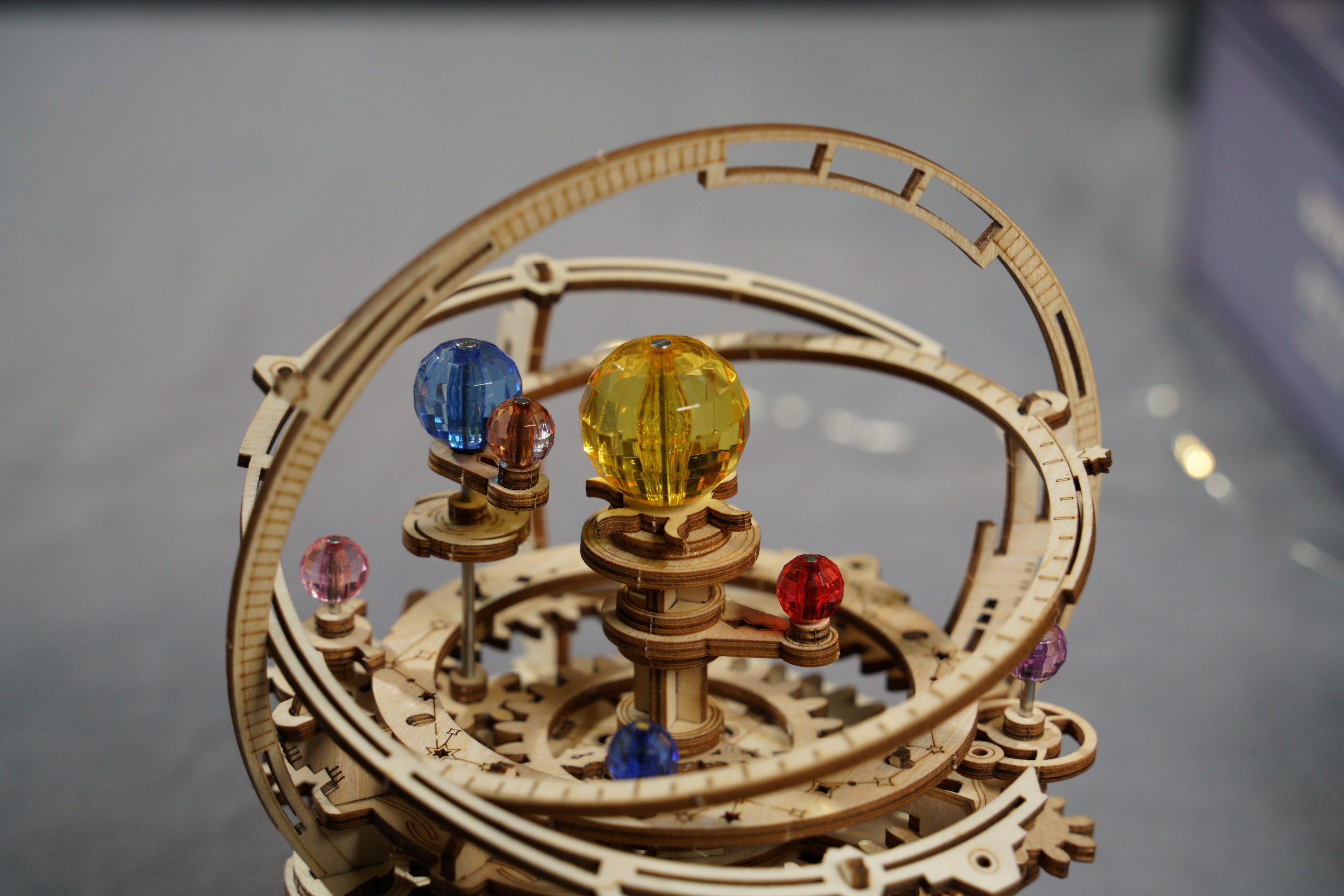 Kozmikus tánc: A mechanika elforgatásakor az égitestek mozgásba lendülnek. A bolygók keringenek, a holdak követik pályájukat, miközben a beépített zenedoboz lágy dallamot játszik. Minden nyugodtan, egyenletesen és hipnotikus módon mozog, éppen úgy, mint az éjszakai csillagos égbolt látványa, csak éppen kézzel fogható közelségben.