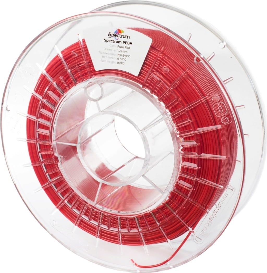 A Spectrum PEBA egy technikailag kifinomult, rugalmas prémium Filament, amely poliéter blokk-amid kopolimeren alapul, és nagy rugalmasságot, dinamikus ellenálló képességet és megbízható mechanikai tulajdonságokat igénylő alkalmazásokhoz lett kifejlesztve. Speciális molekulaszerkezete az elasztomer anyagok rugalmasságát a műszaki műanyagok méretstabilitásával kombinálja, így nagyobb ellenálló képességet, alacsonyabb csillapítást és jobb energiaelnyelést kínál a TPU-hoz képest.