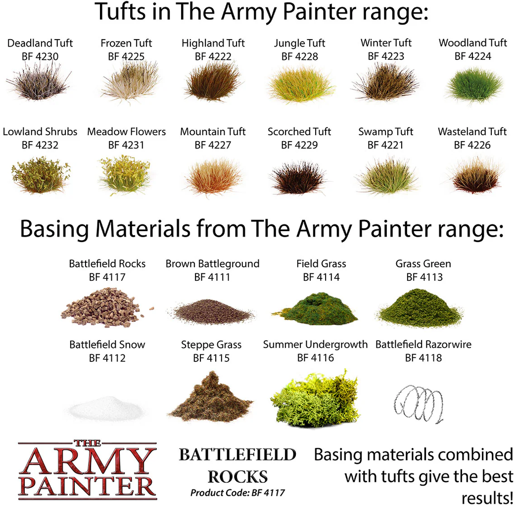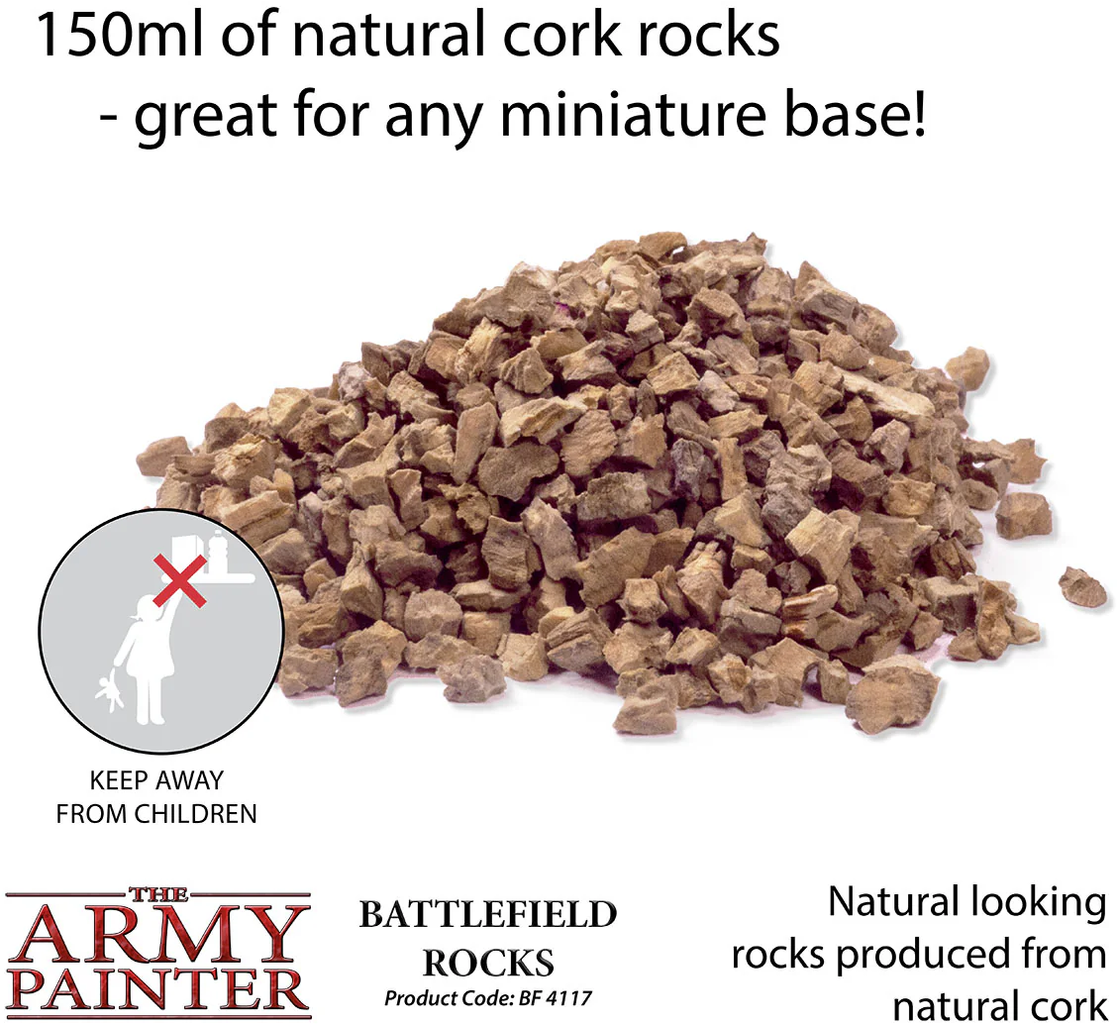 Változtassa diorámáit vad és érintetlen tájakká a The Army Painter Battlefield Rocks segítségével. A természetes megjelenésű kövekkel lenyűgöző sziklaalakzatokat, szurdokokat vagy barlangokat hozhat létre. Kombinálja őket más Basing-anyagokkal, hogy miniatúráit lélegzetelállító környezetbe ágyazza.