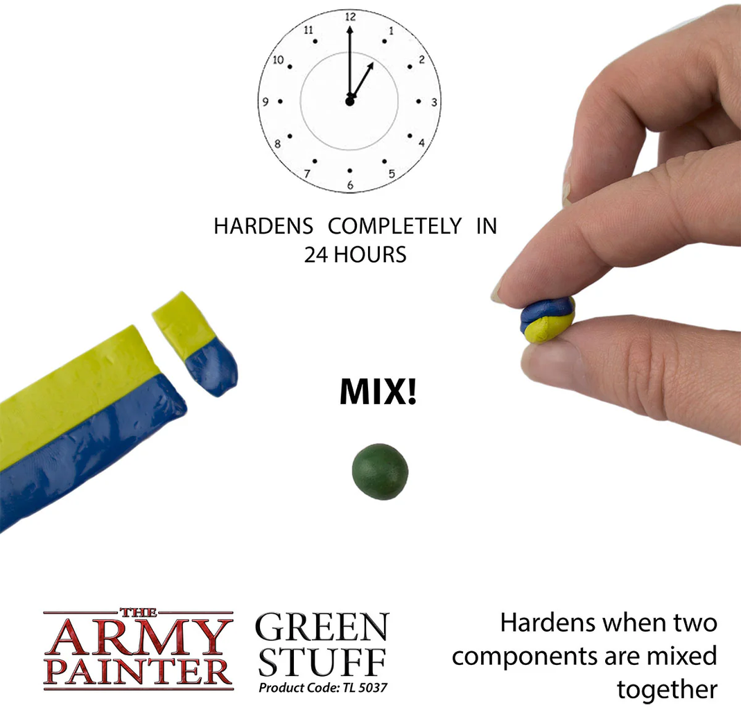 Egyszerűen keverje össze a sárga és a kék komponenst, hogy egy sima, könnyen alakítható masszát kapjon, amely életre kel a kezei között. A Green Stuff tapad műanyagon, fémen és Resin felületeken, majd stabil, részletgazdag formává keményedik, amely tökéletesen festhető. Emellett elegendő időt biztosít Önnek (kb. 20–30 perc), hogy még a bonyolult részleteket is kidolgozhassa, mielőtt lassan megkeményedne (kb. 8 óra elteltével), és mindörökre rögzítené az Ön mesterművét.